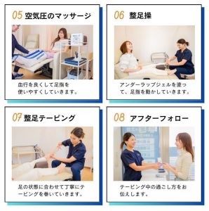 ・テーピング施術のため、当日は着圧のない脱ぎ履きしやすいソックスや、キツくない靴でご来院ください。